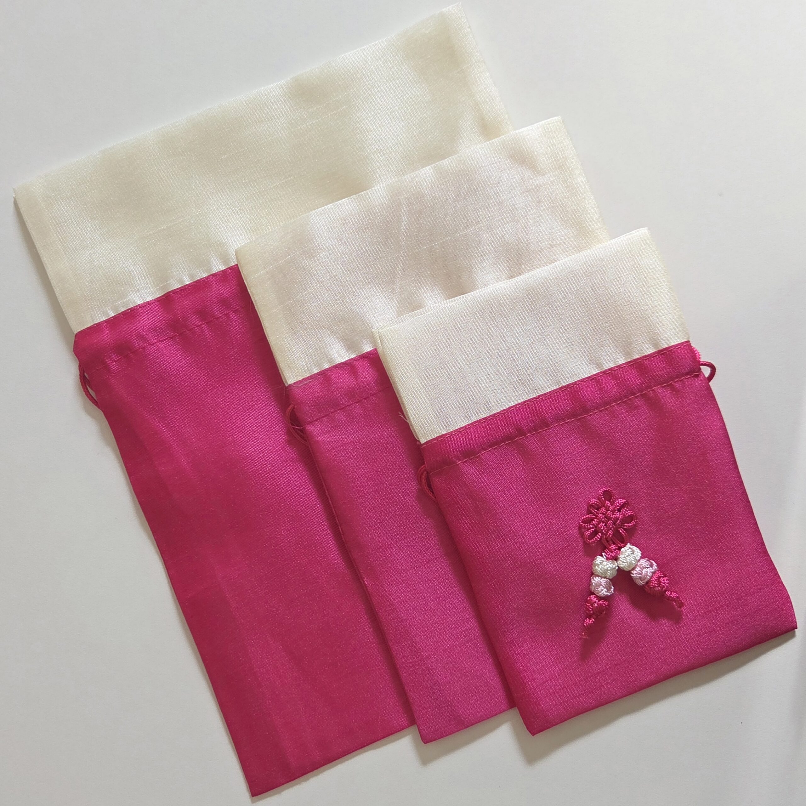 The traditional small Korean silk pouches are called Bokjumeoni (복주머니) in English, which literally translates to “lucky pouch” or “fortune pouch”.
