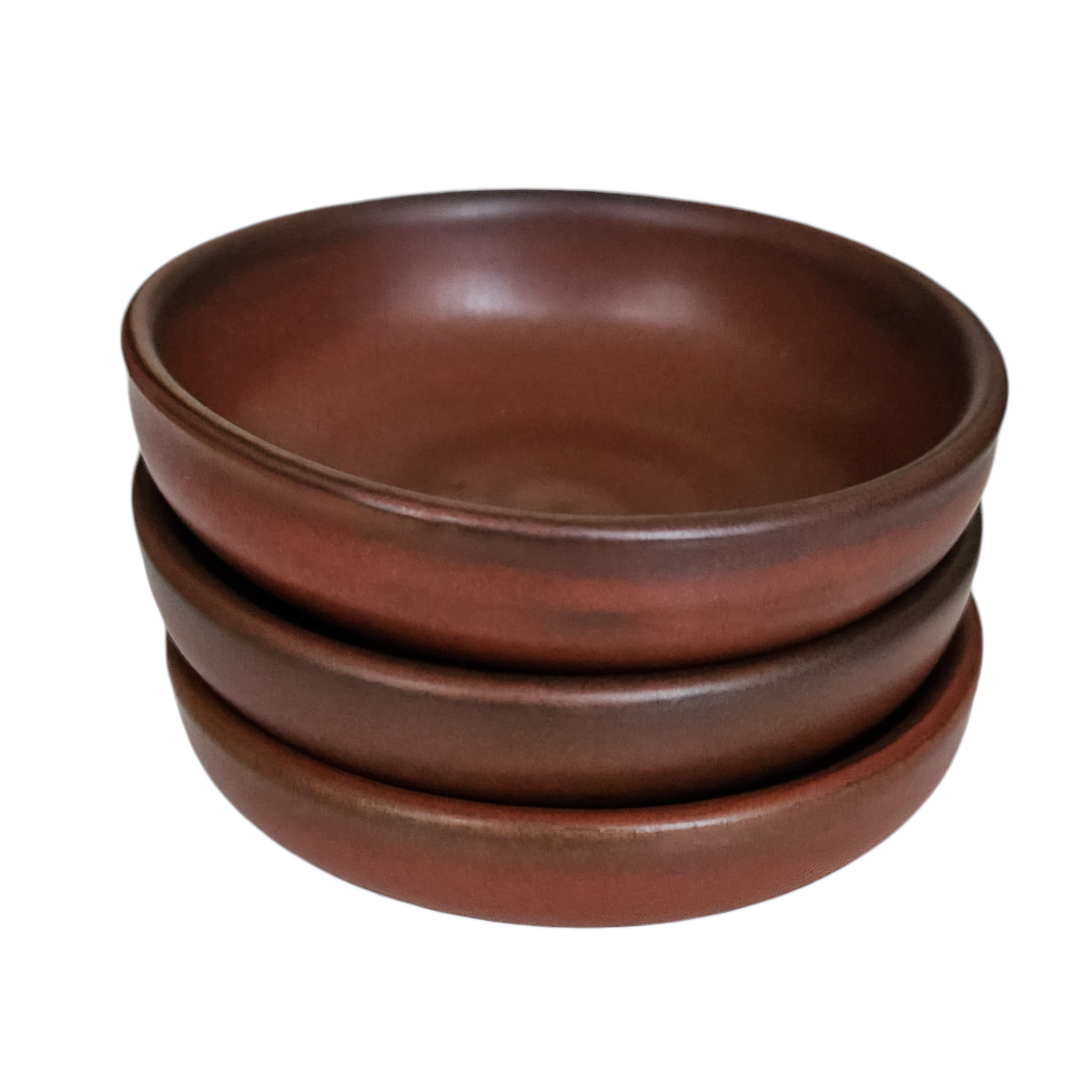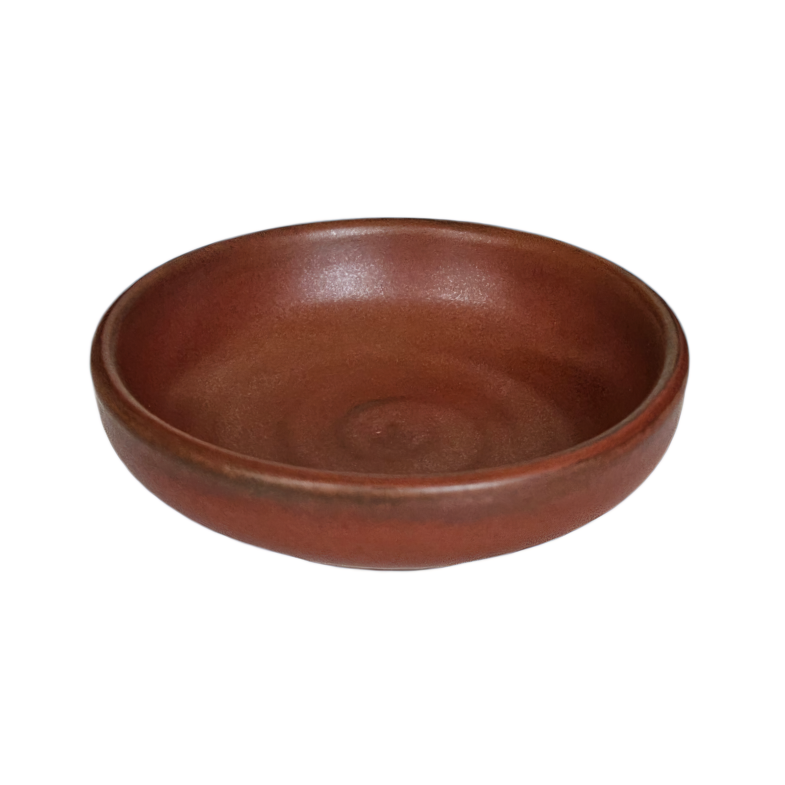 The ceramics has a simple, rustic look. It has a low, shallow design, with a slightly raised edge around the rim. The color is a deep, earthy reddish-brown, similar to the color of burnt terracotta. The surface has a glossy finish with a slight texture, giving it a natural, handcrafted feel. The ceramics are sturdy and thick, suggesting a good weight and durability. Perfect for serving Korean banchan (side dishes).