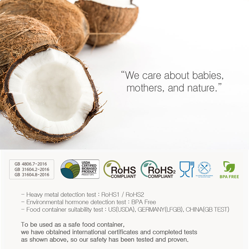 • Healthy baby cup from nature – UINLUI’s baby trays degrade and return to nature after disposal as we add the biodegradation agent (T-MBA) to coconut shells.